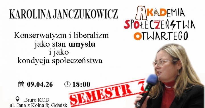 Zapraszamy na spotkanie z Karoliną Janczukowicz, które odbędzie się 09.04.2026 o godzinie 18.00 w biurze KOD Pomorze w Gdańsku przy ul. Jana z Kolna 8. Tematem rozmowy będzie „Konserwatyzm i liberalizm jako stan umysłu i jako kondycja społeczeństwa.”